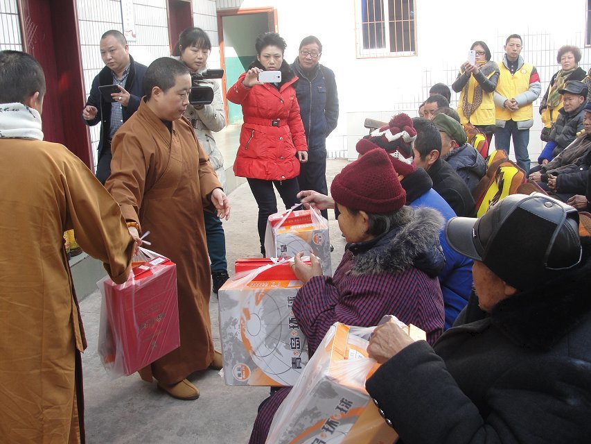 勝智法師(shī)親自(zì)為(wèi)老 φ(lǎo)人(rén)們分(fēn)發慰問(wèn)品